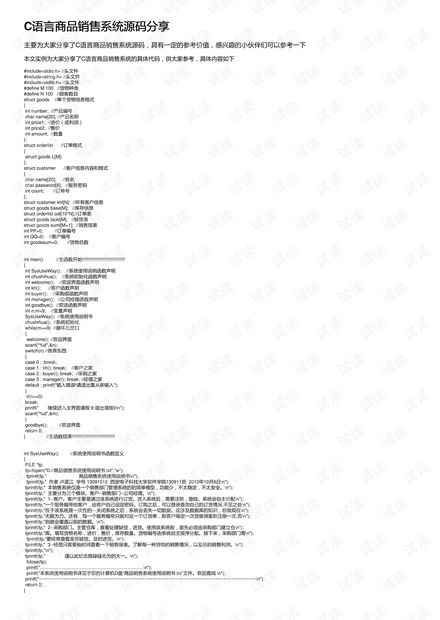 服装销售系统的核心功能之一是对数据的管理。包括但不限于商品信息的管理、销售数据的跟踪、库存数量的监控以及顾客信息的记录。在C语言中,结构体(struct)是管理复杂数据类型的有效方式。通过结构体,可以定义商品、销售记录、库存和顾客信息等,让数据“活”起来。
