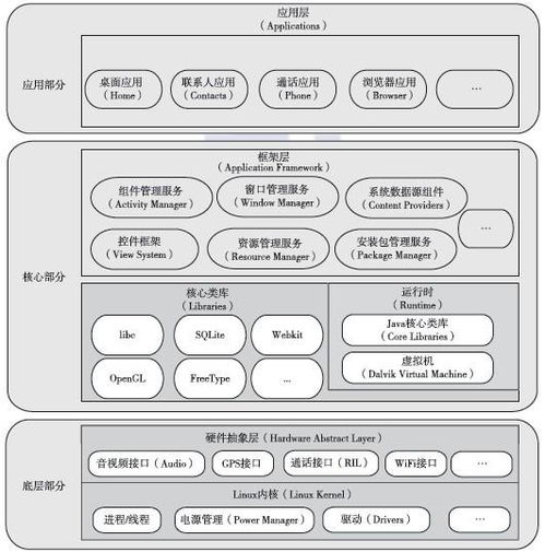 通过以上四层,安卓系统构架为我们呈现出一幅宏伟的科技画卷。每一层都发挥着不可或缺的作用,共同构建起这座科技巨塔。正是这样的架构,让安卓系统成为全球最受欢迎的移动操作系统之一。