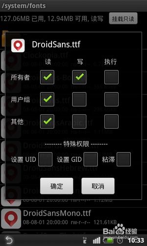 5. 修改权限:长按替换后的字体文件,选择“权限”,将“用户”和“组”的“读”和“写”权限都勾选上。