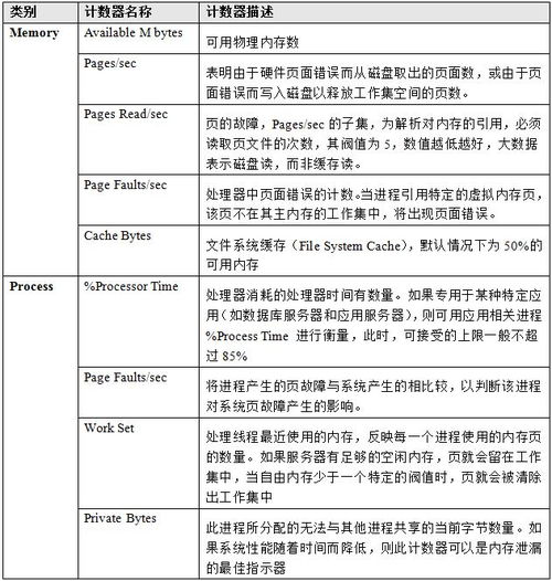 性能计数器是用来监控系统性能的一些计数器,如CPU使用率、内存占用率、磁盘I/O等。通过对这些计数器的分析和比较,可以了解系统的性能状况并进行相应的优化。