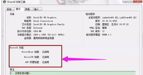 点击“显示”选项,查看Directdraw加速、Direct3D加速、AGP纹理加速三个选项是否已启用。如果未启用,请手动开启。