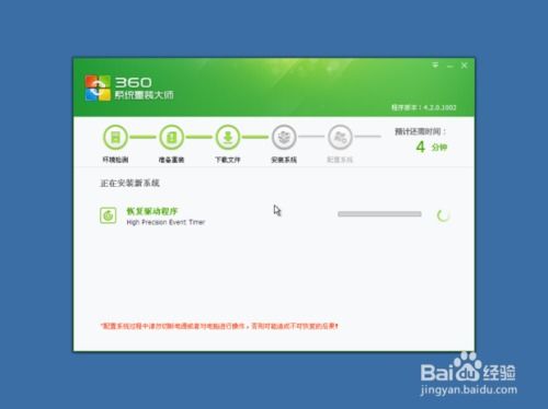 首先,您需要在360官方网站或者通过搜索引擎下载360快速重装系统。下载完成后,双击安装包,按照提示完成安装。安装过程中,请确保您的电脑已连接网络,以便下载必要的系统文件。