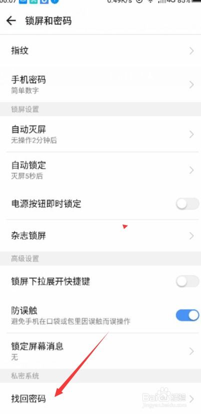 进入【锁屏和密码】界面后,继续向下滑动,找到【找回密码】选项。这个选项通常位于界面底部,可能需要点击展开更多选项。