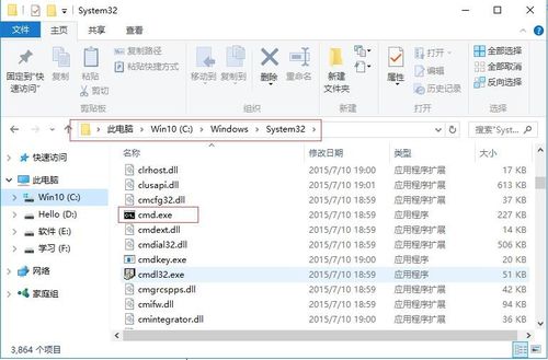 在C:WindowsSystem32(32位系统)或C:WindowsSysWOW64(64位系统)目录下找到cmd.exe文件。