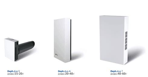 Dephina的Deph系列新风系统产品,包括集中式新风系统Deph.home和Deph.Wohn系列,以及非集中式的Deph.duo系列壁挂式新风净化器。