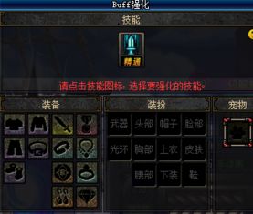 2. 点击BUFF强化系统,进入换装系统。在这里,你可以选择需要登记的装备,包括武器、防具、首饰、时装、宠物和光环等。
