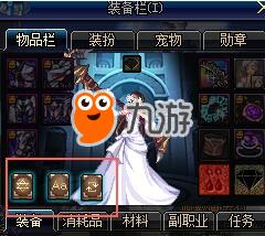 1. 打开人物物品栏界面,在人物装备下方找到三本小书,从左边起数,第三本就是BUFF强化系统。