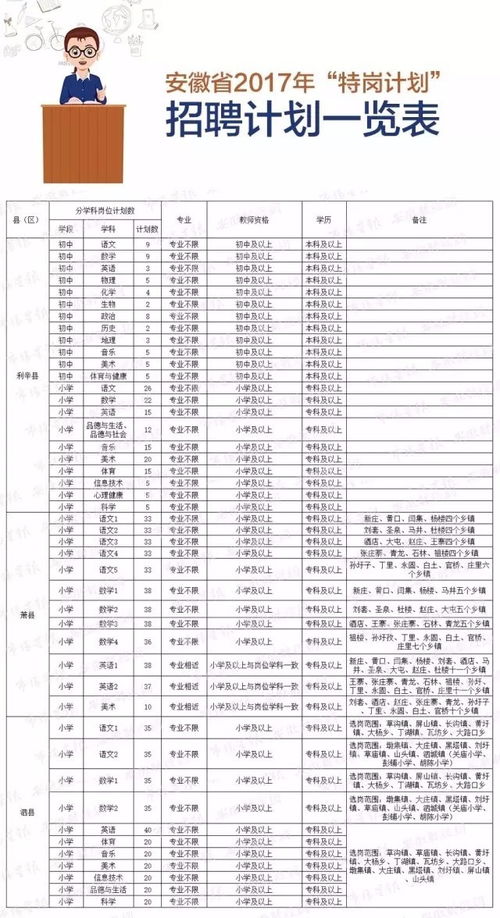 随着我国教育事业的发展,特岗教师计划作为一项重要的政策,旨在解决农村义务教育阶段师资力量不足的问题。2017年,安徽省特岗教师招聘考试吸引了众多师范类毕业生和社会人士的关注。本文将为您全面解析2017年安徽省特岗教师招聘考试的相关信息。