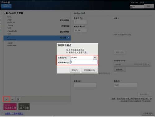 选择要安装CentOS 7的磁盘分区,将Windows系统所在的磁盘分区划分为两个部分:一个用于安装CentOS 7,另一个用于交换空间。