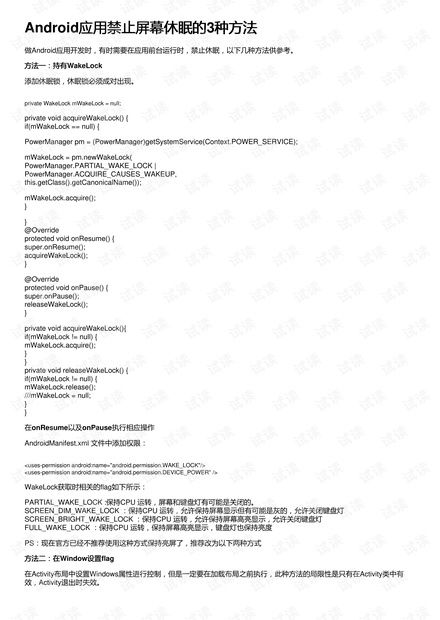 在Android系统中,休眠机制是为了节省电量而设计的。当设备处于休眠状态时,屏幕会关闭,CPU和部分硬件会降低功耗。然而,在某些应用场景下,如游戏、视频播放等,我们需要保持设备唤醒状态,以确保应用正常运行。