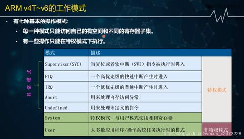 ARM处理器支持多种工作模式,包括用户模式(User)、快速中断模式(FIQ)、系统模式(System)、管理模式(Manager)和特权模式(Privileged)。不同模式下的处理器权限和功能有所不同,用户在编程时需要根据实际需求选择合适的工作模式。