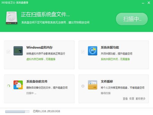 点击“系统盘瘦身”功能后,程序会自动扫描系统盘中的垃圾文件。等待扫描完成后,您可以看到系统盘的可用空间和可清理的垃圾文件数量。