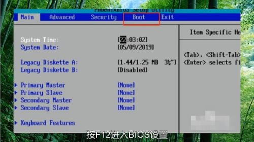 在电脑启动过程中,按下F12键进入BIOS设置界面。不同电脑的进入BIOS键可能不同,如F2、Del、Esc等,请根据实际情况操作。
