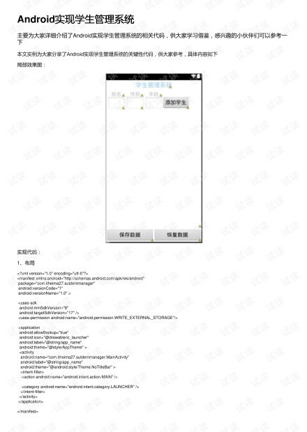 随着移动互联网的快速发展,Android平台以其开放性和易用性,成为了开发各类应用的热门选择。学生信息管理系统作为教育信息化的重要组成部分,其移动化趋势日益明显。本文将介绍Android学生信息管理系统的设计与实现过程,旨在为教育信息化提供一种高效、便捷的解决方案。