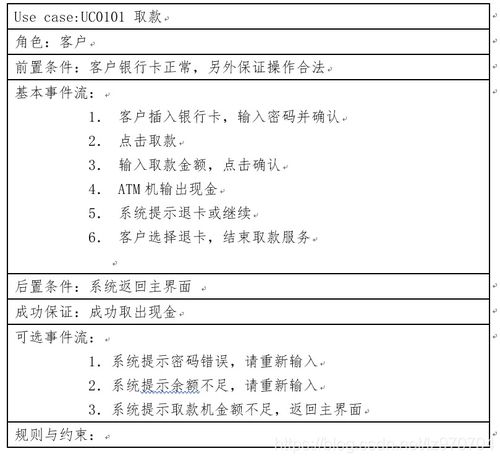 ATM系统用例图是描述ATM系统功能需求的重要工具,它通过图形化的方式展示了系统与用户之间的交互过程。设计合理的ATM系统用例图,有助于提高开发效率、降低开发成本,并确保ATM系统的功能符合用户需求。