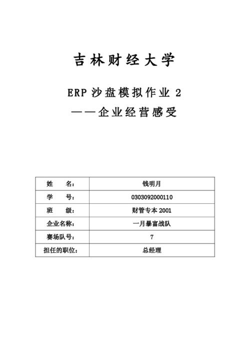 通过学习ERP系统,我深刻认识到其在企业管理中的重要作用。在今后的工作中,我将不断学习ERP相关知识,为企业的发展贡献自己的力量。同时,我也期待ERP系统能够在未来发挥更大的作用,助力企业实现高质量发展。