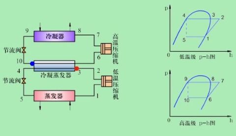 复叠制冷系统是一种采用两种或两种以上制冷剂,通过多个制冷循环实现低温制冷的系统。其基本原理是:高温级制冷剂在低温级制冷剂蒸发器中吸收热量,实现低温制冷;低温级制冷剂在高温级制冷剂冷凝器中释放热量,实现高温制冷。复叠制冷系统主要由压缩机、冷凝器、膨胀阀、蒸发器、制冷剂和辅助设备组成。