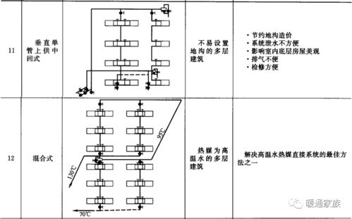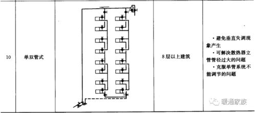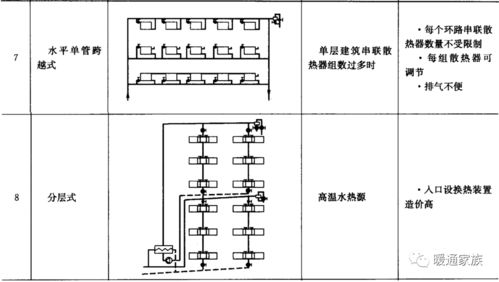 1. 单管系统:供、回水共用一根管道,适用于小规模供暖。