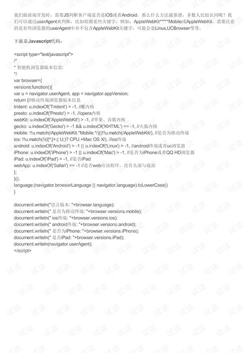 你有没有想过,你的手机里那些神奇的网页应用是怎么知道你用的是安卓系统的呢?其实,这背后有一个小小的秘密,那就是JavaScript(简称JS)的强大功能。今天,就让我来带你一探究竟,看看JS是怎么判断安卓系统的吧!