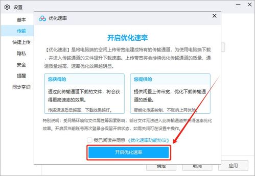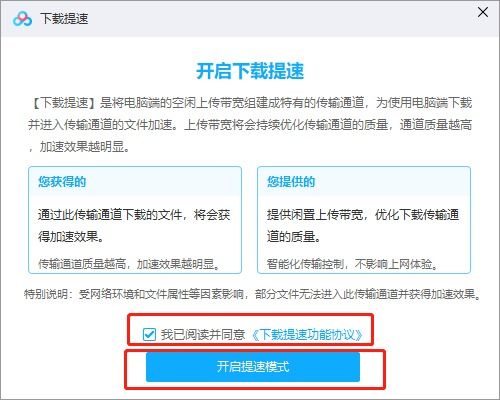 开启下载提速功能,并同意提供上传宽带以优化下载传输速度。